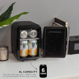 - 4L MINI COOLER – This mini compact cooler is ideal for a bedroom. office or countertop. There’s plenty of space to fit 6 x 330ml drink cans. or a few favourite snacks within handy reach.