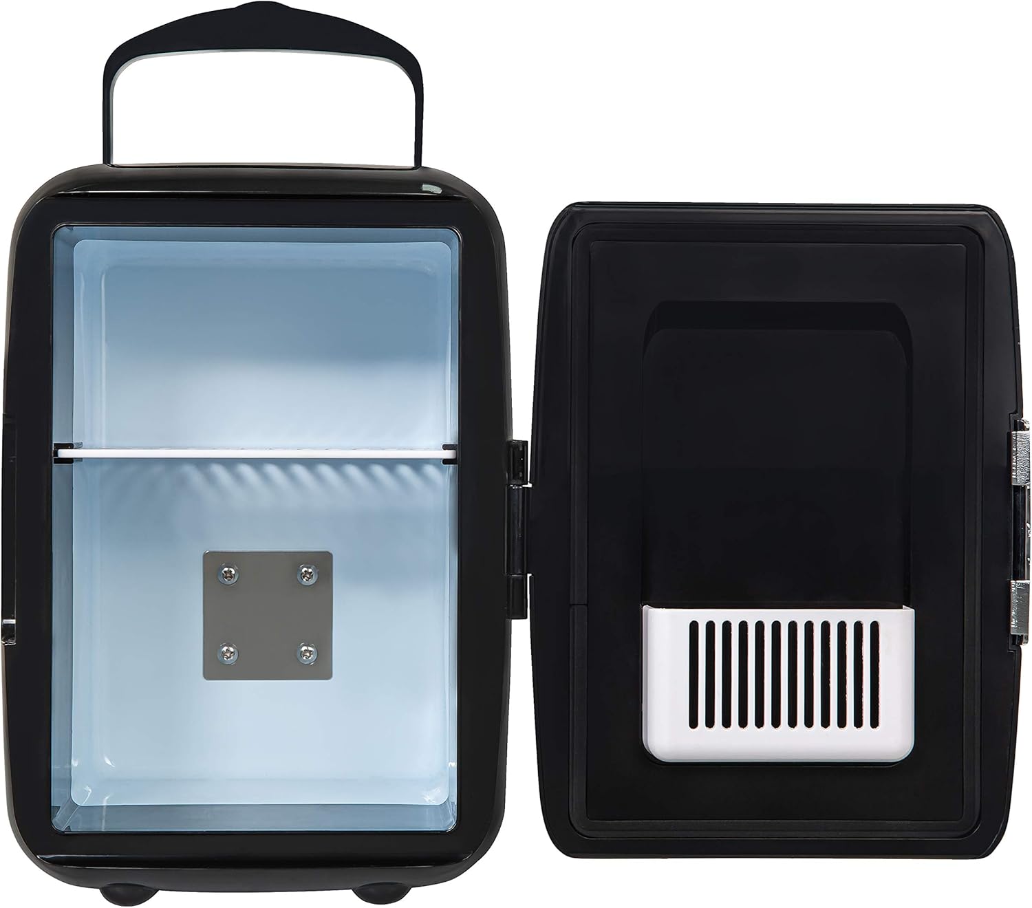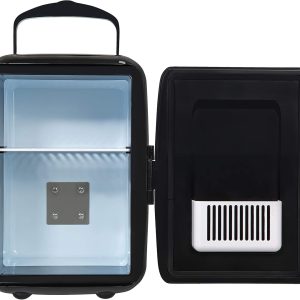 With a sleek black body. streamlined retro curves and chrome accents. this mini cooler combines style with functionality. There’s a door latch to secure your treats. as well as a foldable carry handle to make moving your cooler a breeze. The glossy finish adds a touch of sophistication to any setting. whether you want it on full display. or blending into the background.