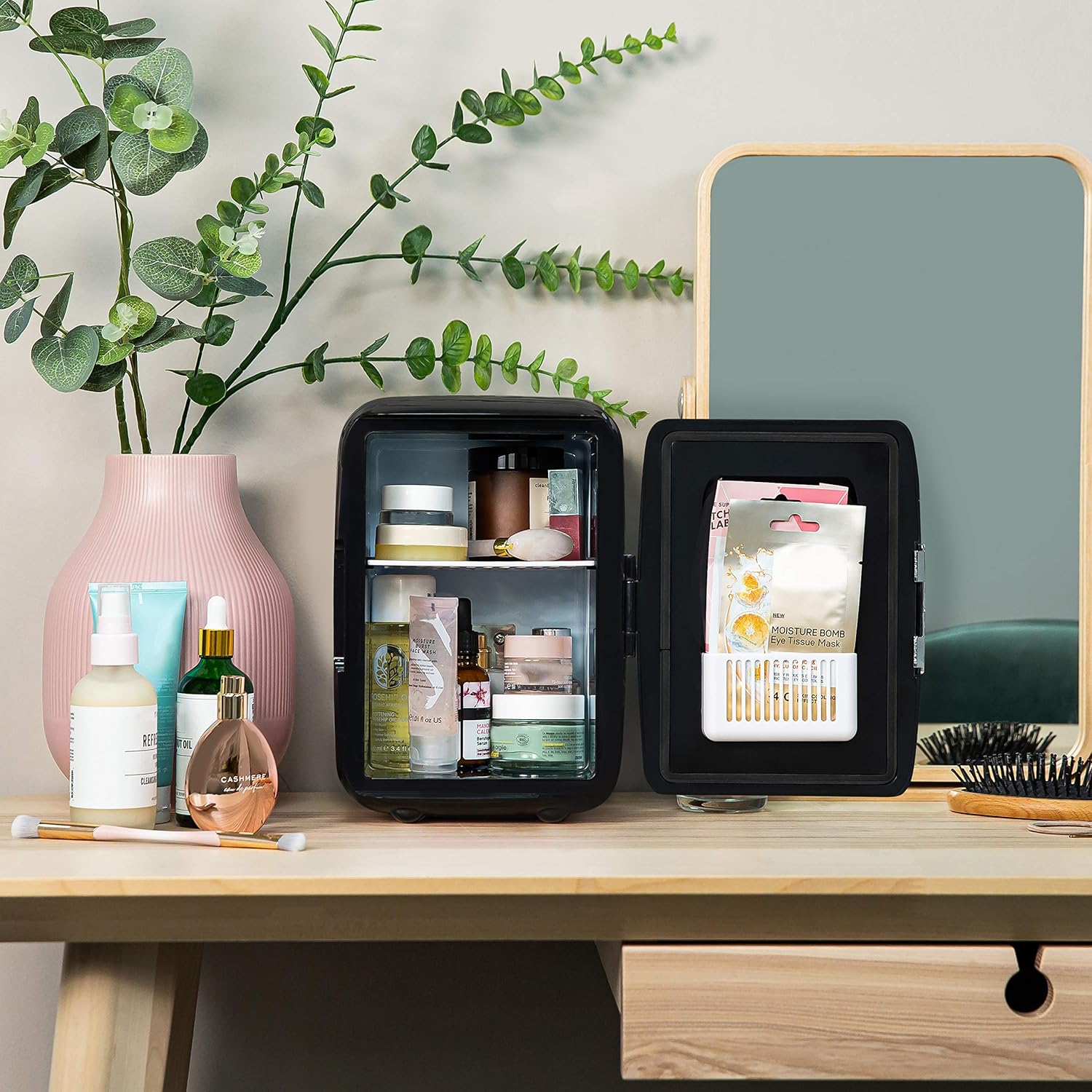 You can store your skincare and makeup in the cooler to help keep them fresher for longer. extending shelf life and reducing harmful bacteria. There’s even a handy pocket on the inner door. perfect for storing face masks!