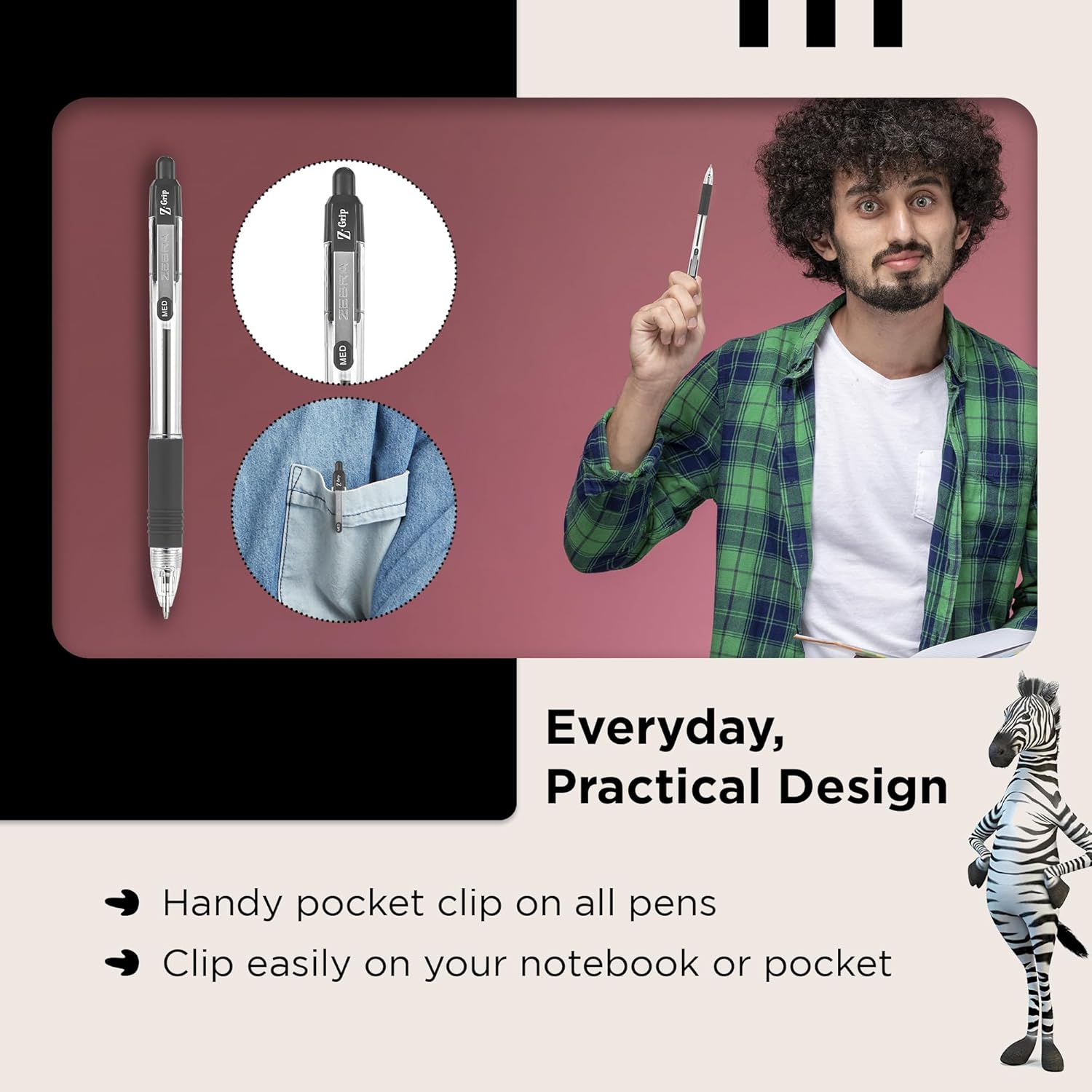 The ZEBRA Z-Grip Retractable Ballpoint Pen is our bestselling favourite. With a comfort grip and stainless steel pocket clip. ideal for homework. journaling. correspondence and notes. Available in 6 different colours for easy colour coding. Enjoy this ballpoint for your everyday writing needs.